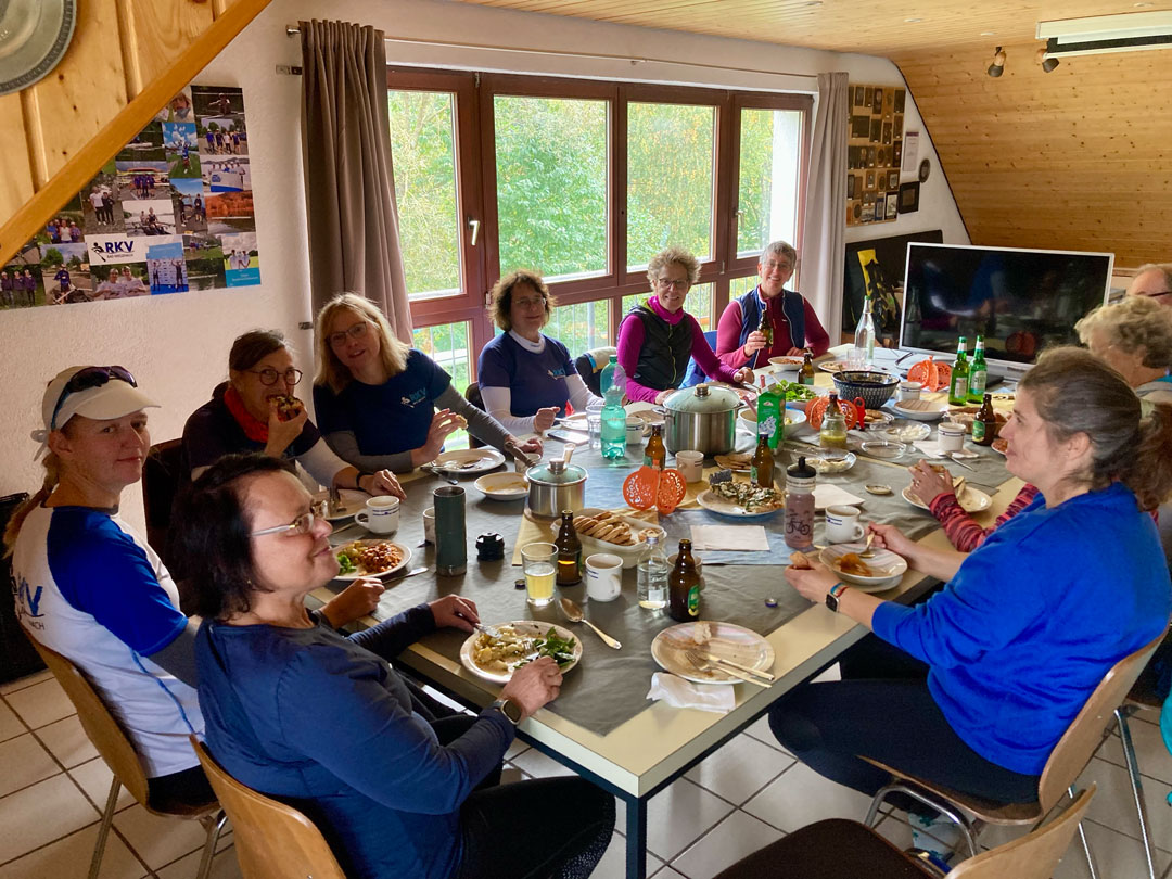 Nach zwei Stauseerunden folgte die wohlverdiente Pause. Im Bootshaus haben wir uns zuerst an unserem mitgebrachten Buffet gestärkt. Das Mittagessen ließ keine Wünsche offen - mit tollen Salaten und Kürbissuppe über Nudeln mit Bolognaisesauce, Pizza (Schnecken) bis hin zu Kuchen, und Nussecken war der Tisch reich gedeckt.